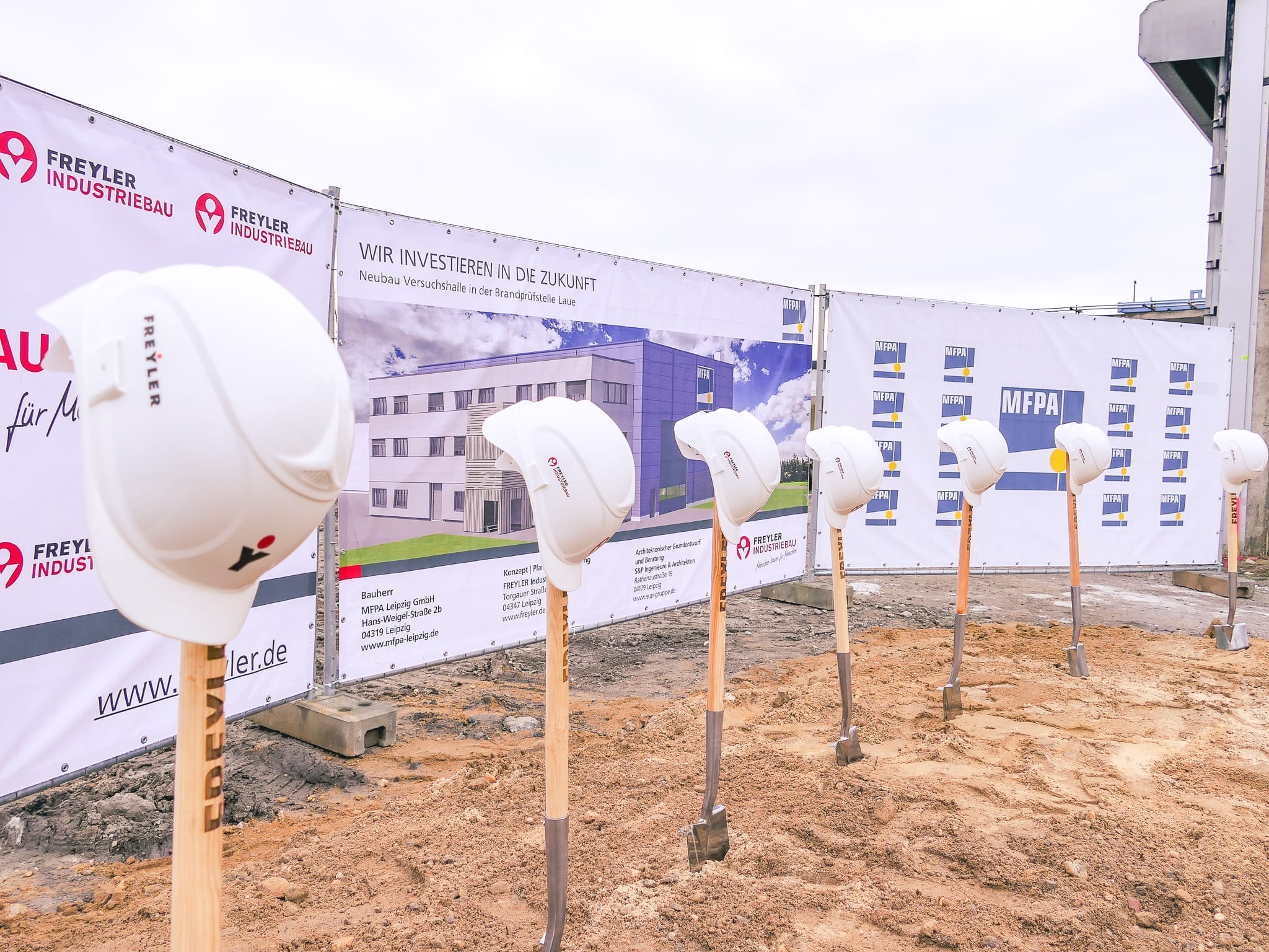 Bereits am 29.11.2021 fand in unserer Brandprüfstelle in Laue bei Delitzsch unter Beteiligung von hochrangigen Vertretern des Regionalentwicklungsministeriums, des Landkreises Nordsachsen und der Stadt Delitzsch ein feierlicher Spatenstich zur Errichtung der neuen Brandprüfhalle mit dreigeschossigem Büro- und Seminarbereich statt.