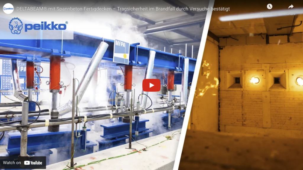 The Peikko company commissioned MFPA Leipzig GmbH to perform a comprehensive fire testing programme, in order to examine the behaviour of prefabricated prestressed concrete ceilings (hollow prestressed concrete plates) resting on DELTABEAM® composite steel girders. The bearing and load transmission from the ceiling to the girder (indirect bearing) and the impact of the deformation of the girder on the ceiling elements’ bearing capacity regarding shear forces (pliable bearing) were examined to allow for safer and more cost-efficient dimensioning.