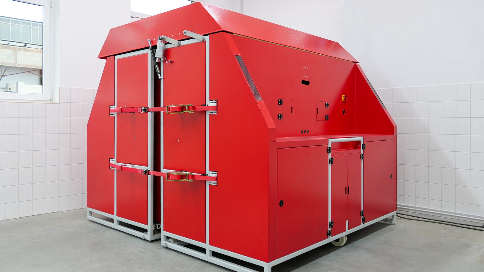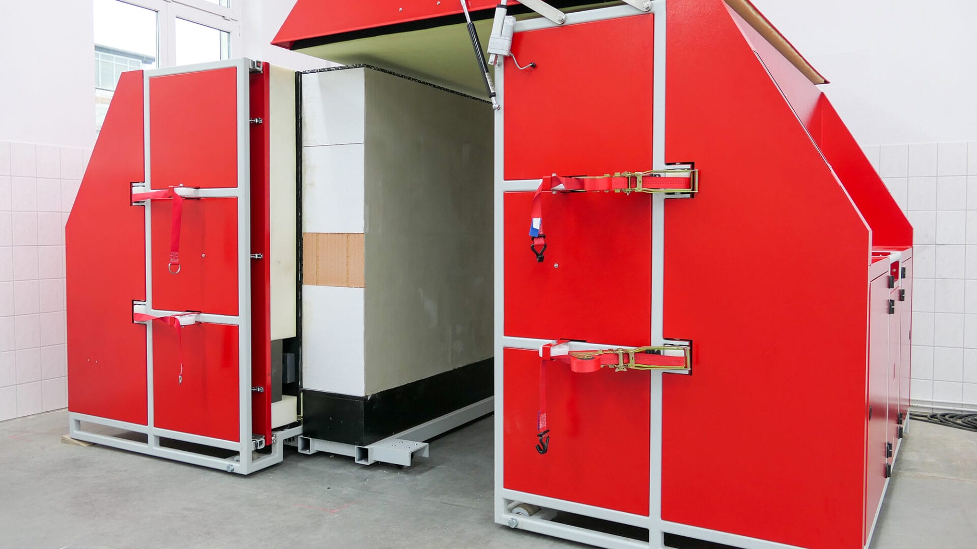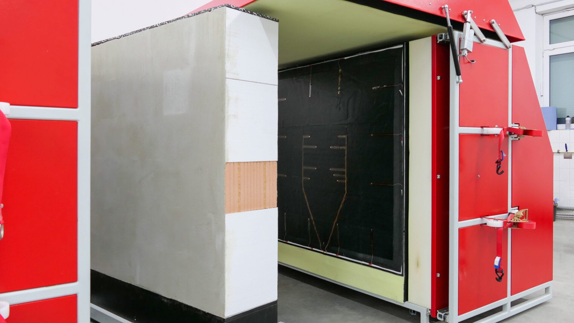 For testing, test specimens measuring approx. 1.5 m x 1.5 m are built up and conditioned in our air-conditioned test room. Wall thicknesses of up to 42.5 cm can be tested. A drying chamber (up to 105 °C) and a platform scale (up to 1500 kg, resolution 50 g) are available for further sample preparation.