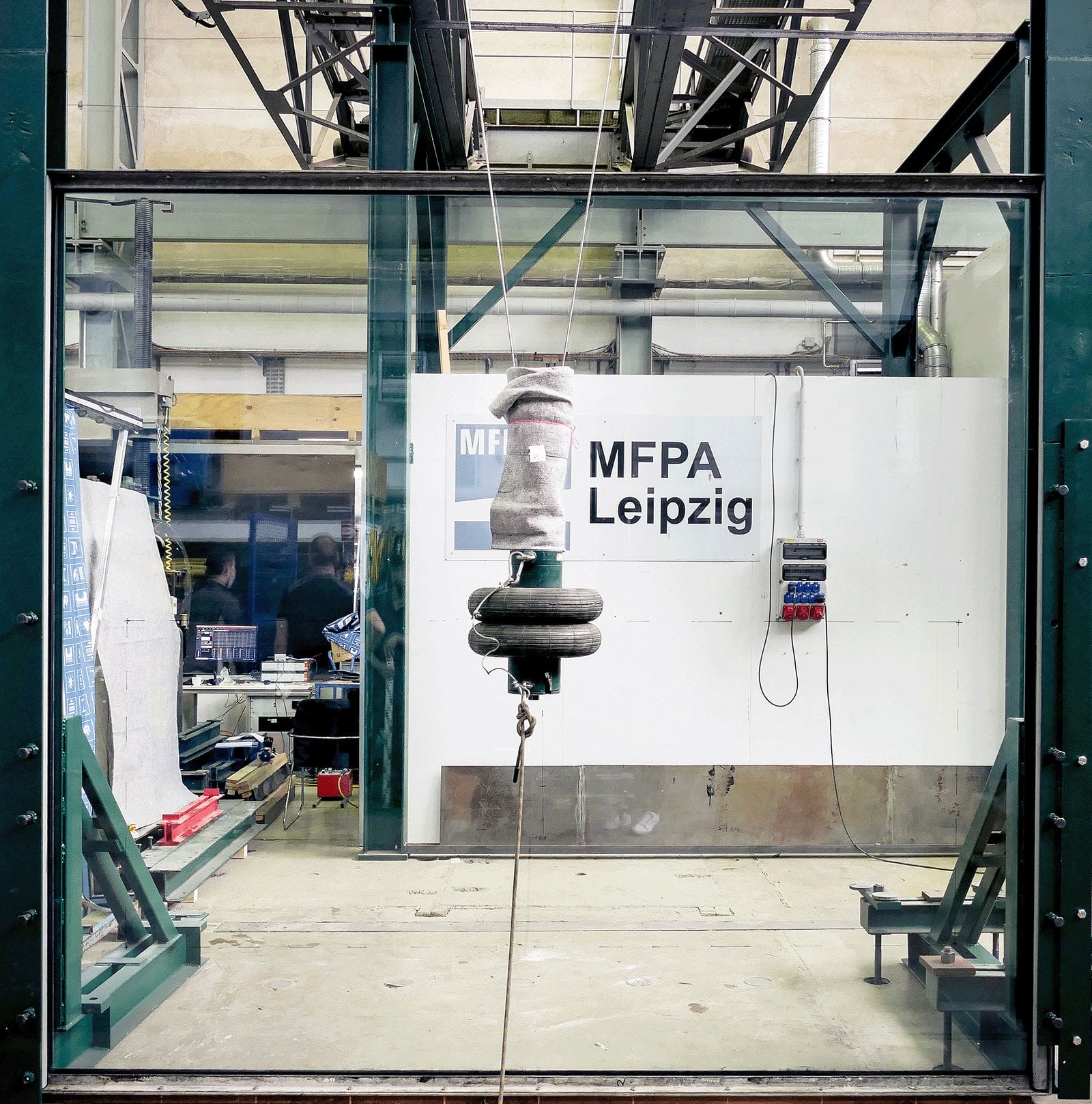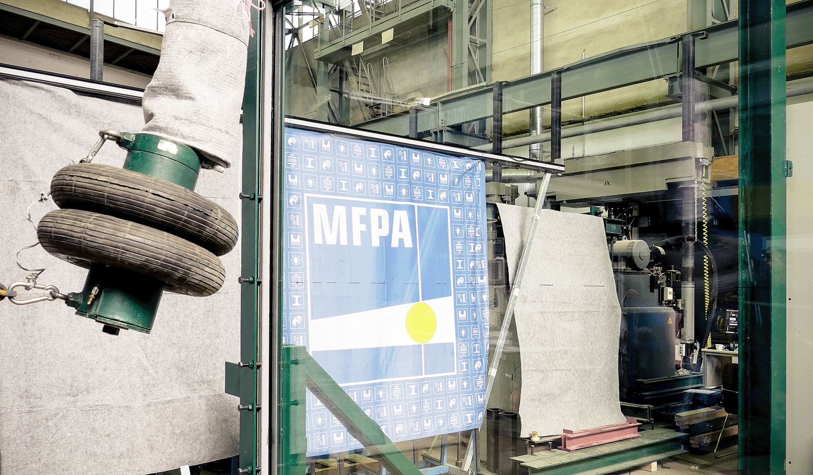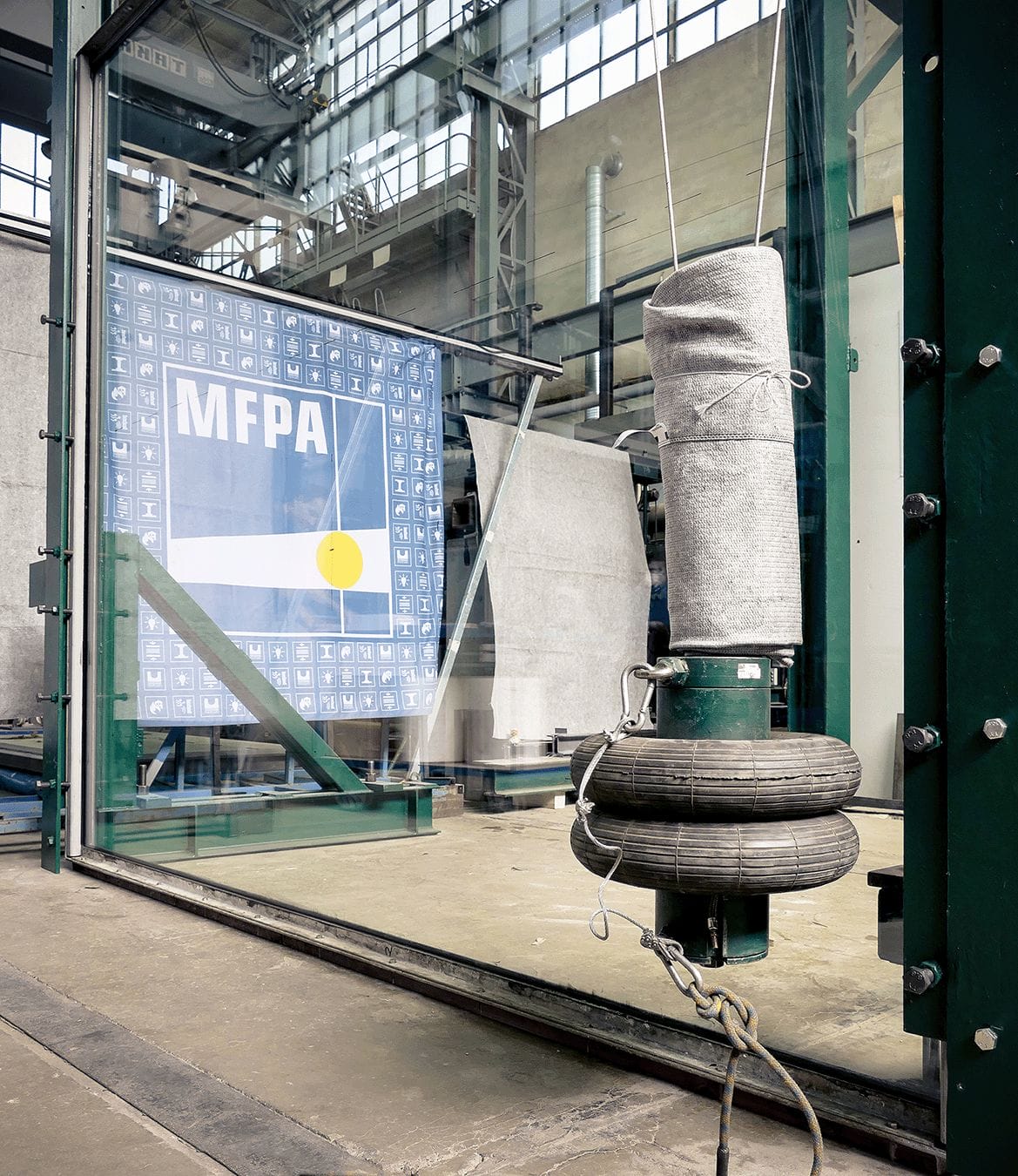 Ziel war es hierbei die Absturzsicherheit der Verglasung durch die Durchführung mehrerer Pendelschläge an verschiedenen Teilen der Glasfassade nachzuweisen. Entsprechend der Vorgaben kamen hierfür ein Pendelkörper mit folgenden Merkmalen zum Einsatz: Zwillingsreifen mit der Masse von 50 kg, einem Innendruck von 3,5 bar und einer Auslenkhöhe von 90 cm.