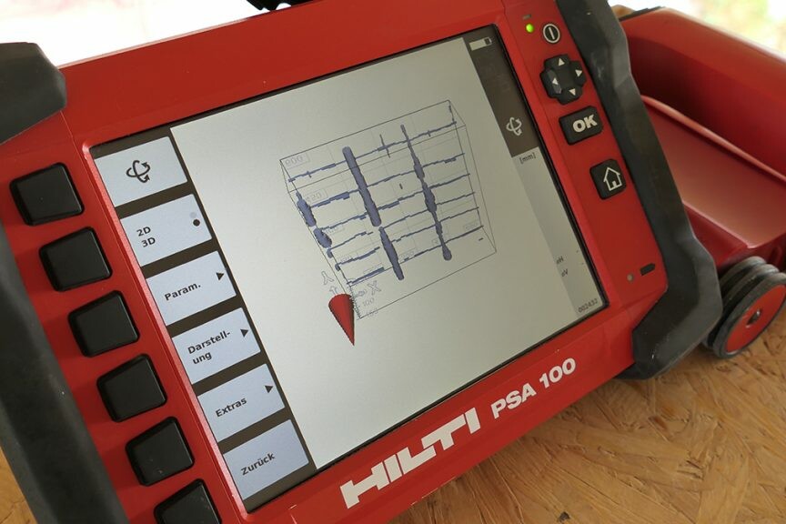 Zerstörungsfreie Bestimmung der Lage und Überdeckung von Bewehrungseisen in Beton. Mit dem Ortungsgerät kann auch der Durchmesser von Bewehrungen abgeschätzt werden.
